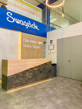 Empezando por la zona de recepcion que se compone de un counter con todas las conexiones y equipos internos, en conjunto con una serie de paneles iluminacion con material visual de la empresa.