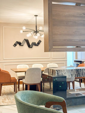 Un estilo clasico con detalles atemporales, incluyendo iluminacion led en repisas. El mobiliario de tela fue todo elaborado a medida para el espacio, cada tela y enchape fue curado por el equipo.